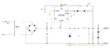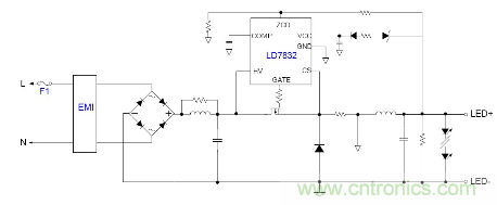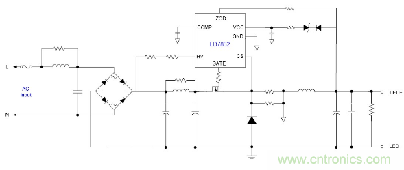 隨著目前法規和能效的需求, 針對LED應用提出高PF以及適應全電壓範圍都能可靠工作的要求, 並且朝小型化方麵發展, 因此之前的填穀式的PFC電路也需要增加兩個高壓電容因體積的限製不太適合應用。有鑒如此, 國內外很多廠商都推出了適應球泡燈和T管之類的非隔離電源應用驅動方案, 下麵就以通嘉科技的LD7832做為典型介紹。