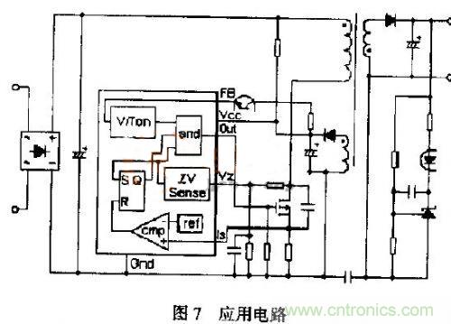 由(9),(10)或可知,調節輸出功率、wendingshuchudianyakeyitiaojiedaotongshijianhuozhankongbihuotiaopinfangshihuojizhongfangshizongheyingyong。dangshuchugonglvxiajianghuodianyuandianyashangsheng,daotongshijianjianxiao,fanzhidaotongshijianzengjia;隨輸出功率的增加或減小變壓器初次級電流峰值均增加或減小,由式(3)可知變壓器的釋放儲能時間也隨之增加或減少,為實現“零電壓”開關,變壓器不能工作在間歇狀態,因此F%IM控製方式不能滿足本文電路的“零電壓”開通的要求。基於上述工作條件的約束,本文電路應采用輸出電壓反饋控製導通時間,用“零電壓”檢測控製開關管導通時刻,即調頻、調占空比工作方式。具體電路可以采用通用器件組合,如圖7。