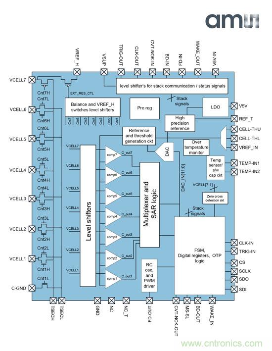 AS8506具有先進的模擬電路,相當於最高七塊電池的電壓,且內外參數的精確度可達到1mV。同時,該設備具有上下可調節的內外電池電壓限額。電池電壓還能實現數字化,精確度可達5mV,並能向主控製器發送報告。AS8506可自動進行主動和被動的電量均衡,或者通過SPI接口進行電量控製。主動電池電量均衡隻需要一個額外的回掃變壓器。AS8506中已經集成了控製電路,通過兩個外部熱敏電阻(NTC)傳感器就能實現溫度測量。
