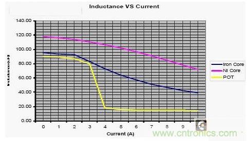 下圖為三種不同的磁芯,其電感量隨電流的變化的曲線。從圖5 中可以看出:在設計汽車音響直流電源濾波器時,要根據工作電流的範圍來選擇合適的扼流圈。當汽車音響的正常工作電流大於3A 時,若選擇圖中POT 磁芯的扼流圈,電感量急劇降低,根本起不到濾波器的效果。