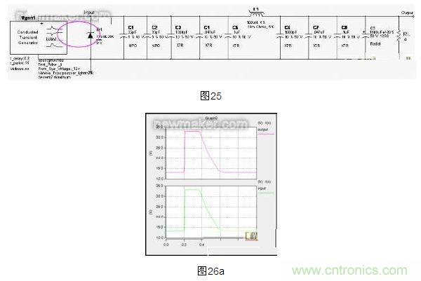 在汽車音響電源濾波器設計時,不僅要考慮各種不同汽車電氣係統瞬態噪音或脈衝的抑製作用,同時,還要加強Over Voltage、Over Current和Reverse Voltage等使用情況的發生。在GMW3172 - Feb.2007 :5.2.4 、VW 801 01-2005-06:3.10和3.11、ISO 16750-2:4.2中規定了過壓(Over Voltage)測試的內容,在 GMW3172-Feb.2007 :5.2.7、VW 801 01-2005-06:3.12和ISO 16750-2:4.3中規定了Superimposed Alternating Voltagedeceshiyaoqiu。youyuputongdianyuanzaoshenglvboqiduilangyongdianyadeyizhinenglijiaocha,tebieshidanglangyongdianyashangshenghuanmanqiekuandujiaodashi,rongyichuxianzukangbupipei,shidianganxianquandadaocibaohe,suoyizaidianyuanzaoshenglvboqishuruduantongchangzengjialeyigeyamindianzuhuobandaotilangyongdianyayizhiguanyizhilangyongdianya,baohuqicheyinxiangneibudianludezhengchangyunxing。xiamian,zhendui12V汽車供電係統的電源濾波器電路進行參數確定,見圖6。
