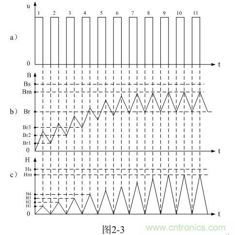 從圖2-3-a)和圖2-3-b)可以看出,每輸入一個直流脈衝電壓,變壓器鐵芯中的磁感應強度B或磁通