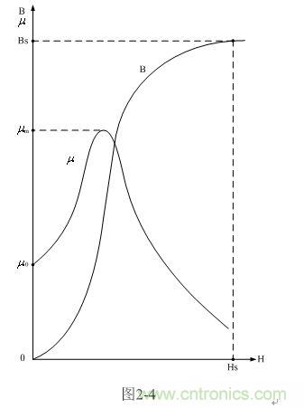圖2-4是變壓器鐵芯導磁率和磁感應強度對應磁場強度變化的曲線圖。圖中,曲線B為磁感應強度對應磁場強度變化的關係曲線,曲線