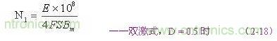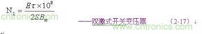 (2-17)和(2-18)式,為計算雙激式開關變壓器初級線圈N1繞組匝數的公式。式中,N1為變壓器初級線圈N1繞組的最少匝數,S為變壓器鐵芯的導磁麵積(單位:平方厘米),Bm為變壓器鐵芯的最大磁感應強度(單位:高斯),τ為脈衝寬度,或電源開關管的導通時間(單位:秒),E為脈衝電壓的幅度,單位為伏,F為開關電源的工作頻率,單位赫芝。
