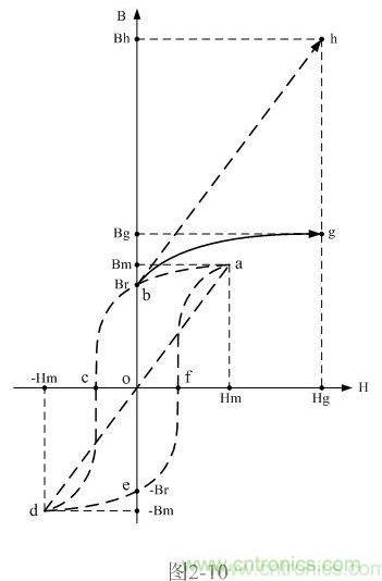 在圖2-10中,虛線表示的磁化曲線a-b-c-d-e-f-a為雙激開關變壓器鐵芯正常工作時的磁滯回線,虛線線段d-a是把開關變壓器鐵芯的磁化曲線理想化後得到的一條曲線(直線),理想磁化曲線是一條斜率等於最大磁感應強度增量與最大磁場強度增量之比,且經過坐標原點的直線;當直線不經過坐標原點時,這條直線可稱為等效磁化曲線(如線段bh)。理想磁化曲線隻有一條,但等效磁化曲線卻有無數多條,且每條效磁化曲線均與理想磁化曲線平行。