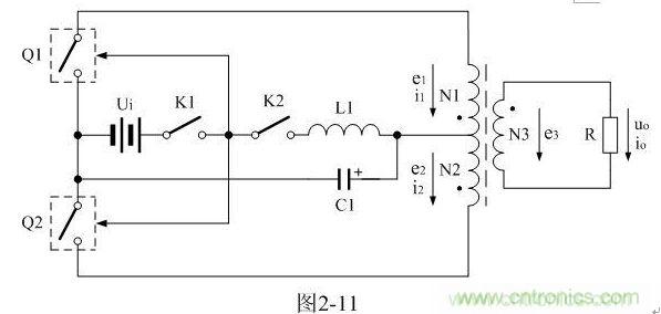 在圖2-11中,開機時,驅動電路電源開關K1首先接通,電源Ui首先給電源開關管Q1、Q2的驅動電路加電;然後開關管電源開關K2接通,由於L1的作用,C1liangduandedianyazhinenghuanmanshangsheng,yibaozhengjiadaobianyaqichujixianquandedianyabuhuituranshenggao,shiliuguobianyaqichujixianquandedianliuguoda,daozhibianyaqitiexinchuxianbaohe;關機時,開關管電源開關K2首先關斷,而後驅動電路電源開關K1再關斷,由於C1兩端的電壓緩慢下降,使變壓器鐵芯可進行充分退磁,以保證下次開機的時候,變壓器鐵芯磁滯回線的初始相位總是從0開始。