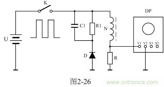 圖2-26中,U是電源電壓,通過控製開關K不斷地接通和關斷,就可以把電源電壓調製成單極性電壓脈衝;N為變壓器初級線圈,D為反激輸出整流二極管;R1為反激輸出負載電阻;C1為濾波電容;R為取樣電阻,通過測量R兩端的電壓,就可以知道流過變壓器初級線圈的電流;取樣電壓被送到示波器DP進行顯示。