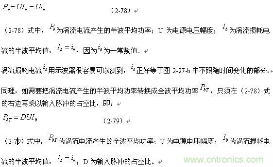 順便指出:(2-79)式的結果,是認為渦流損耗在t1-t2期間(圖2-27-b)完全等於0而求得的,但實際上,在t1-t2期間變壓器初級線圈產生的反電動勢同樣也會在變壓器鐵芯中感應產生渦流損耗電流,即當輸入電壓為0時刻,在變壓器鐵芯中還存在很短暫時間的渦流損耗;由於這種渦流損耗是由反電動勢提供能量來維持的,它將隨著反電動勢能量的衰減很快就衰減到0。