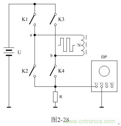圖2-28中,U是電源電壓,N為變壓器初級線圈,控製開關K1、K2、K3、K4組成橋式開關控製電路,K1和K4為一組,K2和K3為一組,兩組開關輪流接通與斷開,把電源電壓正反向加於變壓器初級線圈兩端;R為取樣電阻,通過測量R兩端的電壓,就可以知道流過變壓器初級線圈的電流;取樣電壓被送到示波器DP進行顯示。