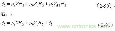 (2-91)式中,咋看起來,變壓器初級線圈N1產生的磁通量 全部穿過變壓器次級線圈N2,它們之間應該不存在漏磁通;但是,初級線圈在麵積S1中產生的磁通 的方向與在麵積Sd2中產生的磁通 的方向,正好互相相反;因此,變壓器初級線圈N1在麵積Sd2中產生的磁通 ,仍然稱為變壓器初級線圈N1對變壓器次級線圈N2的漏磁通,其等效電感同樣稱為漏感。