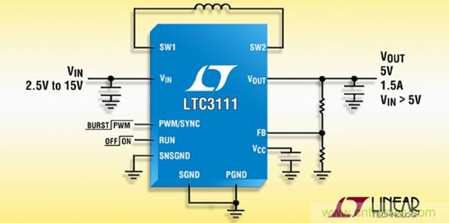 【導讀】淩力爾特推出同步降壓-升壓型轉換器 LTC3111,該器件可在很寬的電源範圍內工作,包括單節或多節電池、超級電容器組和交流適配器,提供高達 1.5A 輸出電流。15V 輸入和輸出、1.5A 單片同步降壓-升壓型 DC/DC 轉換器,效率高達 95% 並可以低噪聲工作。