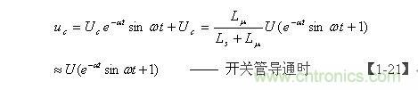 【1-21】式是當電源開關管Q1導通時,分布電容Cs兩端電壓隨時間變化的表達式,它由兩部分電壓組成,一部分是電容Cs兩端電壓的半波平均值Uc ,由【1-19】式表示;另一部分是正弦阻尼振蕩,其最大振幅等於 Uc, e-at是一個小於1的衰減係數。