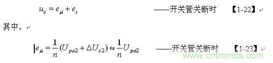 上麵兩式中, uc為電容器C兩端的電壓, eu和 es分別為變壓器初級線圈勵磁電感 Lu和漏感Ls 產生的感應電動勢;Upa2為變壓器次級線圈N2反激輸出電壓的半波平均值,∆Uc2為電容器C2兩端的紋波電壓,n為變壓器次級線圈與變壓器初級線圈的變壓比。