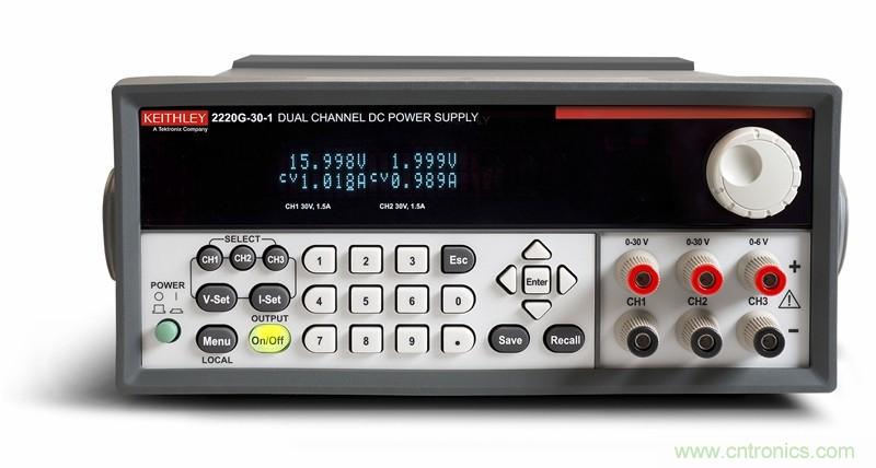與以往的電源產品相比,新發布的兩款電源最大的特點就是增加了GPIB接口,通過GPIB接口,這兩款電源可以更好地滿足控製和通信靈活性的要求。這兩款新的電源適用於讓電路設計、大學實驗室測試、材料研究和器件測試等領域,這些應用中往往需要使用一個以上的輸出,其輸出電壓電流可以滿足元件、電路、模塊及整裝設備的多種輸出需求。2230G-30-1的兩個模擬輸出通道,每通道輸出最大為30V/1.5A/45W,第三個通道輸出為6V/5A/30W,通常用來為數字電路供電——目前市場中的三通道電源模擬輸出最高為25V@1A。此多通道電源具有高輸出電壓電流,電壓設置和回讀分辨率高達1mV,電流設置和回讀分辨率為1mA。以下,我們列舉出這兩款電源的一些突出的性能,為工程師在選型時提供參考。
