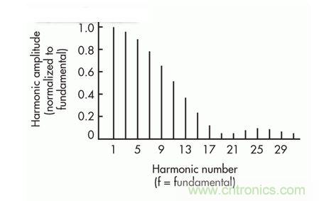 非線性負載可使諧波大小與線路頻率下的基本諧波電流具有可比性。圖4顯示了相對於線路頻率下的基本諧波大小進行標準化的高階諧波電流大小。不過,隻有圖1中給出的在與線路頻率相同的頻率下且與電源線電壓同相的諧波電流(在此案例中為線路頻率下的基本諧波)對提供給負載的平均功率起作用。這些諧波電流會影響同一電力線上的其他設備的工作情況。