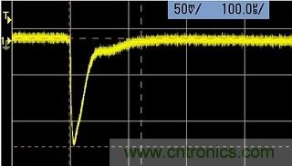這zhe是shi任ren何he電dian源yuan都dou存cun在zai的de正zheng常chang現xian象xiang。當dang負fu載zai吸xi收shou電dian流liu發fa生sheng跳tiao變bian的de瞬shun間jian,就jiu會hui造zao成cheng電dian源yuan輸shu出chu端duan的de電dian壓ya瞬shun間jian偏pian離li設she定ding值zhi。這zhe個ge示shi波bo器qi屏ping幕mu的de截jie圖tu(圖1),就是當我的一個電源的負載電流,從1mA 瞬間變化到500mA時, 輸出電壓經曆了約30uS 瞬間變化。