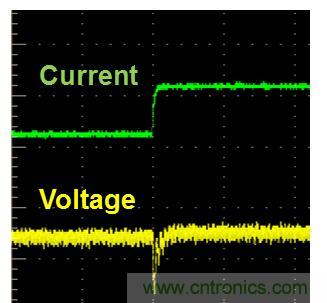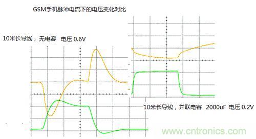 在加入電容後,對提升電路的瞬態響應能力,往往會起到比較明顯的效果。如圖4所示的,我們在用一個通用電源測量GSM手機脈衝電流,在沒有並聯電容的時候,瞬間電源跌落會達到0.6V (見圖4左). 對於一個工作在3.8V的手機來說,這樣大的電源跌落足以造成手機自動關機。當我們並聯了一個2000uF的電容後,電源跌落降到了0.2V以下,得到明顯改善,見圖4右所示(圖中,黃色曲線為電壓,綠色曲線為電流)。