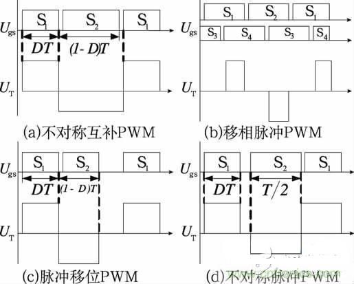 控製型軟開關半橋DC/DC變換器不增加主電路元器件(可增加電感電容元件以實現軟開關條件),通過合理設計控製電路來實現軟開關。圖1給出4種控製型軟開關半橋DC/DC變換器的PWM控製策略。