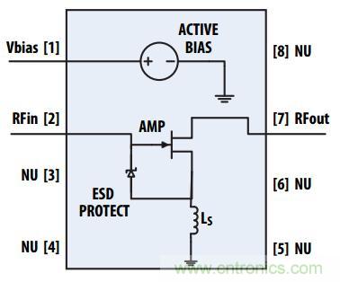 圖:MMIC本身由一個單個的FET共源放大器和一個動態偏壓調製器組成