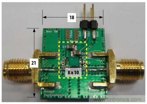 圖中PCB的尺寸為21.5×18×1.4mm,PCB板材有兩層,頂層為Rogers的RO4350,厚度為10mil,底層為低成本的FR4,厚度為 1.2mm,二者的接地銅箔緊緊的結合在一起。射頻連接器是Johnson的SMA接頭,DC電源接頭是2-pin的連接器,被動元件的尺寸都是0402 的,這樣整個元器件區域的大小約為8×10mm2。