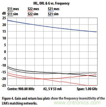 在900MHz,低噪放的噪聲大約為0.3dB,增益大約為18dB,輸入和輸出回波損耗為小於-15dB。另外,在1GHz的帶寬內,回波損耗都可以滿足 這個要求。從係統的角度來說,這個是非常受歡迎的特性。主要是由於傳統的基站需要靠隔離器或者3dB耦合器來滿足係統回波損耗的要求。進一步來說,輸入輸 出匹配的寬帶寬也使得基站的雙工器或者輸入輸出濾波器的使用調試變得簡單,降低了係統的設計複雜度。