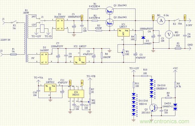 圖:簡單易製、低廉高效的0-30V/10A可調穩壓電源電路原理