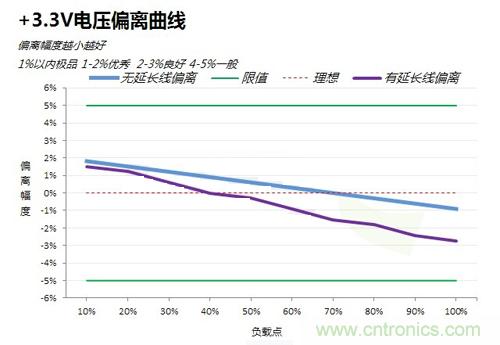 然後看下電源電壓偏離對比,可以發現在加入了延長線之後,電源的電壓也有一定程度的影響。其中+12V影響較大,+5V和+3.3V影響較小。