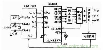 以SA4828與單片機C8051F020為核心構成的控製器電路設計如圖4所示。控製電路根據給定的參數輸出三相SPWM信號給智能功率模塊IP-M,實現對功率晶體管的通斷控製。C8051F020通過8位P0端口與SA4828的地址、數據管腳AD0~AD7相連,工作時,單片機首先對SA4828進行初始化,定義載波頻率,電源頻率範圍、死區、最小脈衝取消時間等參數。然後向SA4828的控製寄存器傳送電源的頻率控製字和幅度控製字等參數。正常工作時,根據需要對SA4828的控製數據進行修改,實現係統的反饋與實時控製,以及調壓控製。為實現係統的穩壓功能,采用平均值反饋PI調節。輸出電壓經隔離送入C8051F020單片機的A/D轉換口即P3.0口,轉換結果參與PI運算,運算結果即為SA4828幅度控製寄存器的控製字。從RPHT~BPHB的6個引腳輸出相應頻率和電壓的SPWM控製信號,經隔離電路後,分別控製智能功率模塊IPM的6個IGBT的導通與截止,最後在3個輸出端上產生對稱的三相SPWM電壓。SA4828作為單片機的外設,與單片機並聯,通過對單片機編程,隻需將SPWM的初始化信息和控製信息寫入SA4828的相關寄存器,即產生精確的全數字化的三相的SPWM波形。