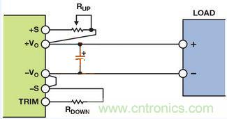 輸出電壓可通過改變連接電源模塊正輸出端或接地端的電阻來進行調節通過連接外部電阻RUP並使RDOWN浮空,可以向上調整輸出電壓(高於標稱輸出電壓),或者通過連接外部電阻RDOWN並使RUP短路(電阻值為零)向下調整(低於標稱輸出電壓)。