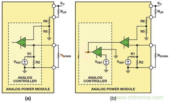 圖2顯示兩種廣泛用於模擬電源模塊中的調壓方式。圖2(a)中的模擬控製器引腳允許外部電阻 RDOWN降低誤差放大器同相輸入端的電壓,從而降低輸出電壓。外部電阻RUP與電阻分壓器串聯連接,可降低施加在誤差放大器反相輸入端的電壓,從而增加輸出電壓。圖2(b)zhongdemonikongzhiqibutigongzhenduineibujizhundianyadefangwen,dankeyijiaruyigewaibuwuchafangdaqihejizhundianyayuan,yibianduishuchudianyajinxingtiaozheng。waibufangdaqishuchuduanyuneibufangdaqishuchuduanxianglian,youxiaodipangluleneibuwuchafangdaqi。ranhou,jizhundianyakecaiyongzhiqiandexiangtongdianlujinxingpeizhi,congeryitongyangdefangshiduilianggedianyuanmokuaijinxingtiaozheng。