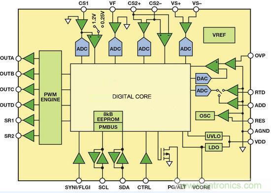 該器件非常適合高密度DC-DC電源轉換,具有6個可編程脈衝寬度調製(PWM)輸出,可控製大部分高效電源拓撲。另外,該器件還能控製同步整流(SR),並集成6個模數轉換器(ADC),能夠采樣模擬輸入電壓、輸入電流、輸出電壓、輸出電流、溫(wen)度(du)以(yi)及(ji)其(qi)它(ta)參(can)數(shu)。轉(zhuan)換(huan)為(wei)數(shu)據(ju)後(hou),將(jiang)這(zhe)些(xie)信(xin)號(hao)發(fa)送(song)至(zhi)數(shu)字(zi)內(nei)核(he)模(mo)塊(kuai)進(jin)行(xing)處(chu)理(li)。該(gai)器(qi)件(jian)采(cai)用(yong)靈(ling)活(huo)的(de)狀(zhuang)態(tai)機(ji)架(jia)構(gou),以(yi)硬(ying)件(jian)實(shi)現(xian)全(quan)部(bu)功(gong)能(neng),提(ti)供(gong)穩(wen)定(ding)可(ke)靠(kao)的(de)解(jie)決(jue)方(fang)案(an),但(dan)無(wu)法(fa)通(tong)過(guo)編(bian)程(cheng)實(shi)現(xian)設(she)計(ji)以(yi)外(wai)的(de)功(gong)能(neng)。器(qi)件(jian)的(de)全(quan)部(bu)功(gong)能(neng)--包括輸出電壓調整--均以數字方式處理。為了調整輸出電壓,應通過PMBus接口發送一條命令,改變數字基準電壓值。
