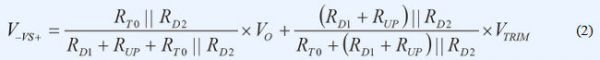 VS+引腳上的正常工作電壓為1V。若 VTRIM為1V左右且RT0遠大於RD2,則可忽略電路的其餘分支部分。複合網絡用作簡單分壓器,並調節RUP電阻值,提供類似於模擬控製器的特性,實現了模擬電源模塊中的電壓向上調整。