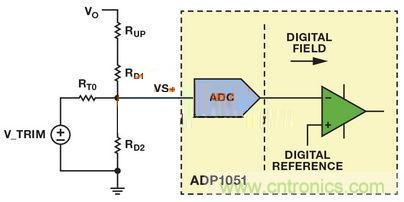 其中,VO是電源模塊的實際輸出電壓。采用標準反饋網絡,則輸出電壓無法以模擬方式調整。如圖4所示,通過加入RUP、RT0和VTRIM的方式重新配置反饋網絡可對比例輸出電壓進行調節。於是檢測電壓為: