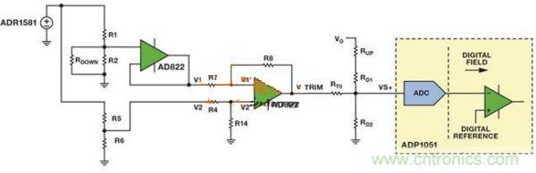 圖5中zhong的de電dian路lu具ju有you兼jian容rong模mo擬ni向xiang上shang或huo者zhe向xiang下xia調tiao壓ya的de功gong能neng兩liang個ge電dian阻zu分fen壓ya器qi產chan生sheng兩liang個ge基ji準zhun電dian壓ya,其qi中zhong一yi個ge基ji準zhun電dian壓ya表biao示shi模mo擬ni控kong製zhi器qi所suo需xu的de輸shu出chu基ji準zhun電dian壓ya,另ling一yi個ge表biao示shi內nei部bu基ji準zhun電dian壓ya。利li用yong一yi個ge電dian壓ya跟gen隨sui器qi來lai避bi免mian所suo需xu的de輸shu出chu基ji準zhun電dian壓ya與yu後hou續xu電dian路lu相xiang互hu影ying響xiang。利li用yongAD822 FET輸入運算放大器,將所需的輸出基準電壓(V1)從模擬控製器的內部基準電壓(V2)中去除,得到所需的電壓差。此電路的線性放大增益確保了VTRIM足夠大,從而能對VVS+產生影響。
