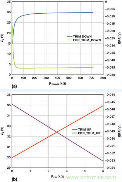 圖6:使用重新配置的反饋網絡後,調整ADP1051輸出電壓的計算結果:(a)向下調整 (b)向上調整