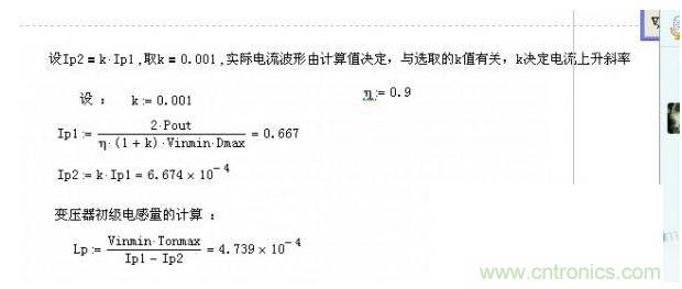 K值就是上麵說的電流連續比上麵計算書定義的Ip2是電流上升前沿Ip1是電流上升後沿。所以當K=0的時候變壓器是工作在臨界模式以下的為防止計算出錯一般習慣取0.001.