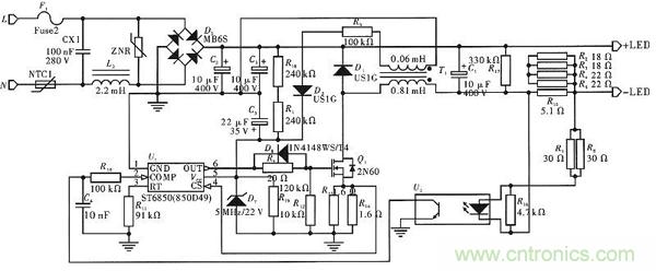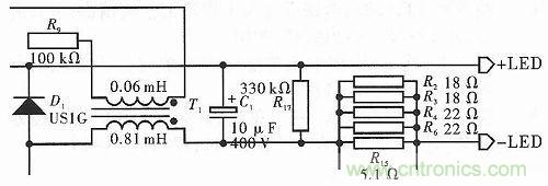 如圖2所示,此電路通過變壓器輸出適當的電流,當有LED負載時,電路中通入適當的電流和頻率使LED正常工作;當沒有負載時,變壓器中仍然殘留有能量,需要釋放。此時由R17等(deng)構(gou)成(cheng)的(de)回(hui)路(lu),可(ke)以(yi)慢(man)慢(man)地(di)釋(shi)放(fang)變(bian)壓(ya)器(qi)中(zhong)的(de)電(dian)能(neng)。但(dan)當(dang)電(dian)流(liu)突(tu)然(ran)減(jian)小(xiao)時(shi),變(bian)壓(ya)器(qi)中(zhong)會(hui)產(chan)生(sheng)感(gan)應(ying)電(dian)動(dong)勢(shi),由(you)此(ci)會(hui)產(chan)生(sheng)較(jiao)高(gao)的(de)反(fan)向(xiang)電(dian)壓(ya),可(ke)能(neng)會(hui)擊(ji)穿(chuan)器(qi)件(jian)。為(wei)了(le)克(ke)服(fu)這(zhe)個(ge)問(wen)題(ti),在(zai)線(xian)圈(quan)的(de)兩(liang)端(duan)並(bing)聯(lian)一(yi)個(ge)續(xu)流(liu)二(er)極(ji)管(guan)D1,同時在電路輸出端串聯R15,並且在R15兩端並聯R2,R3,R4,R6。R15有降壓作用,並且能為反饋電路提供電壓。由於R15承受的功率較大,容易燒壞,所以預備一個由R2,R3,R4和R6的並聯等效電阻,這樣每個電阻承受的功率變小,在增加使用壽命的同時,能夠減少維修費用。