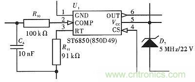如圖4所示,電路通過T1、D7獲取穩定的22 V電壓,供給芯片工作,芯片通過2號引腳進行取樣輸入,C4對電路的頻率和電壓進行控製。