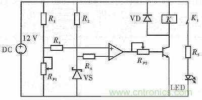 合(he)理(li)的(de)蓄(xu)電(dian)池(chi)充(chong)放(fang)電(dian),不(bu)僅(jin)可(ke)以(yi)延(yan)長(chang)蓄(xu)電(dian)池(chi)壽(shou)命(ming),且(qie)能(neng)提(ti)升(sheng)整(zheng)個(ge)電(dian)路(lu)係(xi)統(tong)的(de)穩(wen)定(ding)性(xing)。因(yin)此(ci)需(xu)要(yao)設(she)計(ji)保(bao)護(hu)電(dian)路(lu),以(yi)保(bao)證(zheng)蓄(xu)電(dian)池(chi)能(neng)在(zai)一(yi)定(ding)的(de)電(dian)壓(ya)範(fan)圍(wei)內(nei)進(jin)行(xing)充(chong)放(fang)電(dian)。本(ben)項(xiang)目(mu)使(shi)用(yong)3級級聯的12 V鉛酸蓄電池。由於過充電路與過放電路有相似性,本文隻給出蓄電池的過放電路,如圖5所示。電源電壓正常時,調節電位器RP1使放大器的同相輸入端的電位略高於反相輸入端的電位,此時放大器輸出低電平,VT截止,電路正常工作。當電源電壓<10.5 V時,反相輸入端的電位大於同相輸入端的電位,放大器會輸出高電平,調節RP2,使VT導通,此時負載與電源斷開。