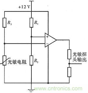 qiyouguangdianzhuanhuanmokuaiheguangmindianzuzucheng。guangdianzhuanhuanyoubijiaoqilaishixian。dangguangmintantouganyingdeguangzhaoqiangdubuqiangshi,bijiaoqihuishuchugaodianwei,fouzeshuchudidianwei。jutidianlurutu6所示。R1分擔電路電壓,依照外界環境條件,選擇適當的電阻R2,控製比較器中正相輸入的電壓值,使其作為比較器工作的參考電壓;R3起(qi)到(dao)保(bao)護(hu)光(guang)敏(min)電(dian)阻(zu)以(yi)及(ji)分(fen)壓(ya)的(de)作(zuo)用(yong)。光(guang)敏(min)電(dian)阻(zu)的(de)阻(zu)值(zhi)隨(sui)著(zhe)外(wai)界(jie)光(guang)強(qiang)的(de)變(bian)化(hua)而(er)變(bian)化(hua),這(zhe)樣(yang)就(jiu)可(ke)將(jiang)光(guang)信(xin)號(hao)變(bian)換(huan)成(cheng)電(dian)壓(ya)信(xin)號(hao),以(yi)此(ci)作(zuo)為(wei)信(xin)號(hao)電(dian)壓(ya)連(lian)接(jie)到(dao)比(bi)較(jiao)器(qi)的(de)反(fan)相(xiang)輸(shu)入(ru)端(duan)。比(bi)較(jiao)兩(liang)個(ge)輸(shu)入(ru)端(duan)的(de)電(dian)壓(ya)大(da)小(xiao)。若(ruo)信(xin)號(hao)電(dian)壓(ya)較(jiao)小(xiao),比(bi)較(jiao)器(qi)輸(shu)出(chu)高(gao)電(dian)平(ping),否(fou)則(ze)比(bi)較(jiao)器(qi)輸(shu)出(chu)低(di)電(dian)平(ping)。從(cong)而(er)實(shi)現(xian)在(zai)明(ming)亮(liang)條(tiao)件(jian)下(xia)輸(shu)出(chu)低(di)電(dian)平(ping),在(zai)黑(hei)暗(an)條(tiao)件(jian)下(xia)輸(shu)出(chu)高(gao)電(dian)平(ping)的(de)設(she)計(ji)要(yao)求(qiu)。
