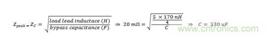 將指定峰值阻抗設為等同於由負載引線電感和旁路電容組成LC電路的特性阻抗。在本例中,假設有4條並聯雙絞線電纜運行,電感降低為原來的1/4。根據下麵的公式,得出電容值。