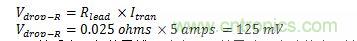 以一個具有25A供電,伴有5A瞬變電流的負載應用為例。其中,電源電壓設為 2.5V,通過5英尺長的14AWG布線連接至IC測試板。由於是低電壓供電,如果電壓有超過100mV的跌落,通常是不可接受的。14AWG線每英尺的電阻為2.5mΩ,由此,在電源輸出和IC測試板之間的導線回路存在25mΩ電阻。根據歐姆定律,我們可以計算出導向回路上可能出現的壓降: