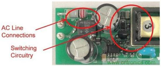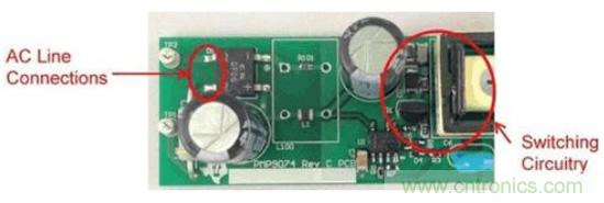 圖1是這些非計劃中電容的一個實例。圖中的右側是一個垂直安裝的FET,所帶的開關節點與鉗位電路延伸至了圖片的頂部。輸入連接從左側進入,到達距漏極連接1cm以內的位置。這就是故障點,在這裏FET的開關電壓波形可以繞過EMI濾波器耦合至輸入。