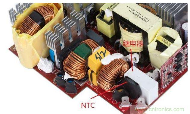 如圖5,一些電源會安裝負溫度係數熱敏電阻(NTCThermistor)和繼電器。安裝在這裏的NTC的作用也是抑製電源接通瞬間的浪湧電流,保護電子設備。原理簡而言之就是“阻值隨溫度升高而降低”。舉個例子,假設上圖電源的NTC在“零電流通過/零功率”狀態下的阻值為20歐,當機器冷啟動時,瞬態電流讓NTC阻值急速下降至低於1歐,隨著後續持續電流的輸入,NTC持續發熱,維持在低阻值,功耗極低。