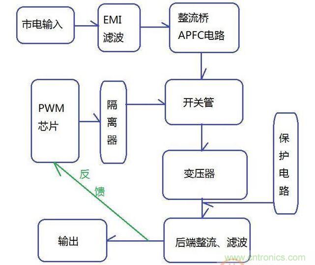 圖1是一個典型的雙管正激拓撲結構,肖特基整流、單路磁放大穩壓,由CWT代工。1是EMI濾波電路。2主要是APFC(主動式功率因數校正),主要包括整流橋、主動PFC電感和升壓電容、PWM芯片。3主要包括變壓器和磁放大電感、待機驅動芯片。4是後端整流,二次側(輸出端)電路。兩條散熱片上,2和3間釘著開關管,3和4間釘著整流管。圖上沒框住的還有三顆光耦,沒特意標出的有保護電路、輸出線材、背部元件、電路板等。大體示意圖表示如圖2: