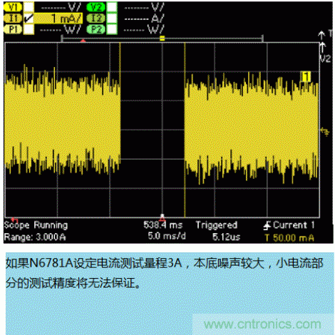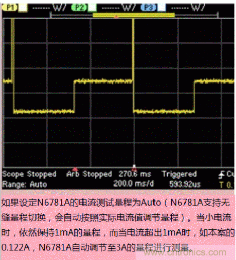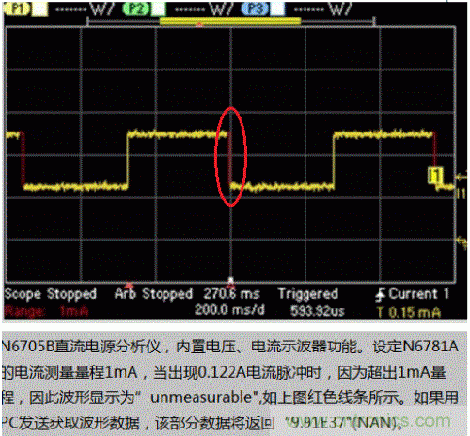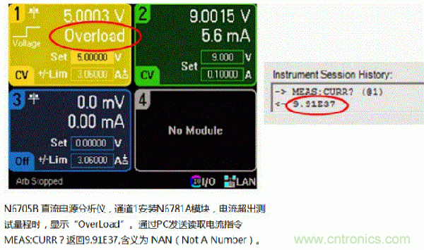 設定N6781A源表模塊的電流量程1mA,然後控製輸出電流超過1mA。此時,顯示屏上直接顯示“OverLoad”,而不是電流的數值。如果通過PC發送讀取電流指令,你會讀到9.91E37,這個數值9.91E37在SCPI(儀表編程命令標準)中被定義為“NAN”(Not A Number)。所有是德科技的測試儀表都是遵循SCPI標準的,當實際值超出量程時,電源返回9.91E37。NAN(9.91E37)實際代表一個32bit浮點數,在所有測量儀表中預計都不會出現這麼大的數值。