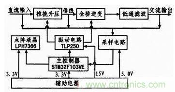 逆變電源硬件結構如圖2所示。主要包括直流推挽升壓電路、正弦逆變電路、輸出濾波電路、驅動電路、采樣電路、主(zhu)控(kong)製(zhi)器(qi)和(he)點(dian)陣(zhen)液(ye)晶(jing)構(gou)成(cheng)。其(qi)中(zhong),直(zhi)流(liu)升(sheng)壓(ya)部(bu)分(fen)將(jiang)輸(shu)入(ru)電(dian)壓(ya)升(sheng)高(gao)至(zhi)輸(shu)出(chu)正(zheng)弦(xian)交(jiao)流(liu)電(dian)的(de)峰(feng)值(zhi)以(yi)上(shang)的(de)母(mu)線(xian)直(zhi)流(liu)電(dian)壓(ya),正(zheng)弦(xian)逆(ni)變(bian)部(bu)分(fen)將(jiang)母(mu)線(xian)直(zhi)流(liu)電(dian)壓(ya)逆(ni)變(bian)後(hou)經(jing)輸(shu)出(chu)濾(lv)波(bo)電(dian)路(lu)得(de)到(dao)正(zheng)弦(xian)式(shi)交(jiao)流(liu)電(dian),采(cai)樣(yang)電(dian)路(lu)則(ze)對(dui)母(mu)線(xian)電(dian)壓(ya)、母線電流、輸出電壓、輸出電流、輸入電壓進行采樣,以實現短路保護、過壓欠壓保護、過流保護、閉bi環huan穩wen壓ya等deng功gong能neng。驅qu動dong電dian路lu的de功gong能neng是shi將jiang驅qu動dong信xin號hao的de邏luo輯ji電dian平ping進jin行xing匹pi配pei放fang大da,以yi滿man足zu驅qu動dong功gong率lv管guan的de要yao求qiu。控kong製zhi電dian路lu的de功gong能neng是shi產chan生sheng驅qu動dong信xin號hao,並bing對dui采cai樣yang信xin號hao進jin行xing處chu理li,以yi實shi現xian複fu雜za的de係xi統tong功gong能neng。點dian陣zhen液ye晶jing的de功gong能neng是shi顯xian示shi係xi統tong工gong作zuo信xin息xi,如ru果guo輸shu出chu電dian壓ya、電流以及保護信息等。