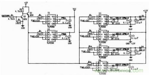 選用東芝半導體公司生產的高速光耦隔離型IGBT/MOSFET驅動芯片TLP250.TLP250具有隔離電壓高、驅動能力強、開關速度快等特點。驅動電路的原理圖如圖3所示。