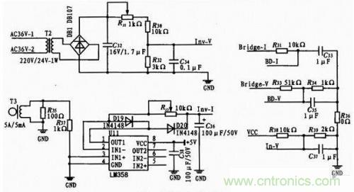 對於輸出電流取樣,本設計中使用了5 A/5 mA電流互感器。由於電流互感器的輸出為毫伏級的交流信號,為了能夠被單片機內部AD模塊采集到,必須將其整流成直流信號並加以放大。而普通二極管整流電路對毫伏級電壓是無效的,因此,此處采用了由運算放大器(U11,LM3 58)構成的小電壓整流電路。實際測試表明,該電路有效解決了毫伏級信號的采樣問題。