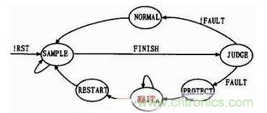 為了提高係統的可讀性以及代碼效率,軟件采用狀態機思想設計,圖5所示為係統的狀態轉換圖。係統上電複位後進入SAMPLE采樣狀態,若檢測到采樣完成標誌FINISH則進入JUDGE狀態進行判斷,如果FAULT不為0即有故障信號(過壓/欠壓、過載、短路),則進入PROTECT狀態關閉輸出,並跳轉到WAIT狀態等待故障信號消除。當故障信號消除後,係統軟重啟,開始新的采樣及檢測。JUDGE狀態後如果未檢測到故障信號,則進入NORMAL正常狀態,進行電壓調整。